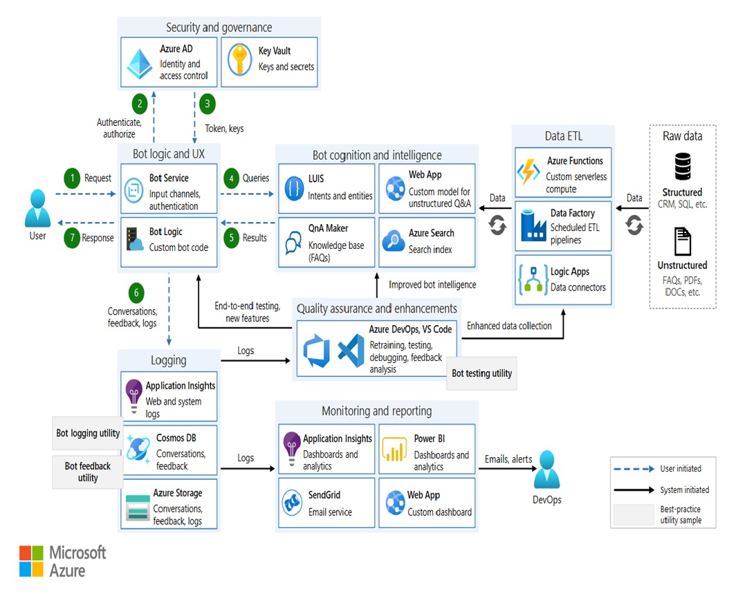 This reference architecture describes how to build an enterprise-grade conversational bot (chatbot) using the Azure Bot Framework.
