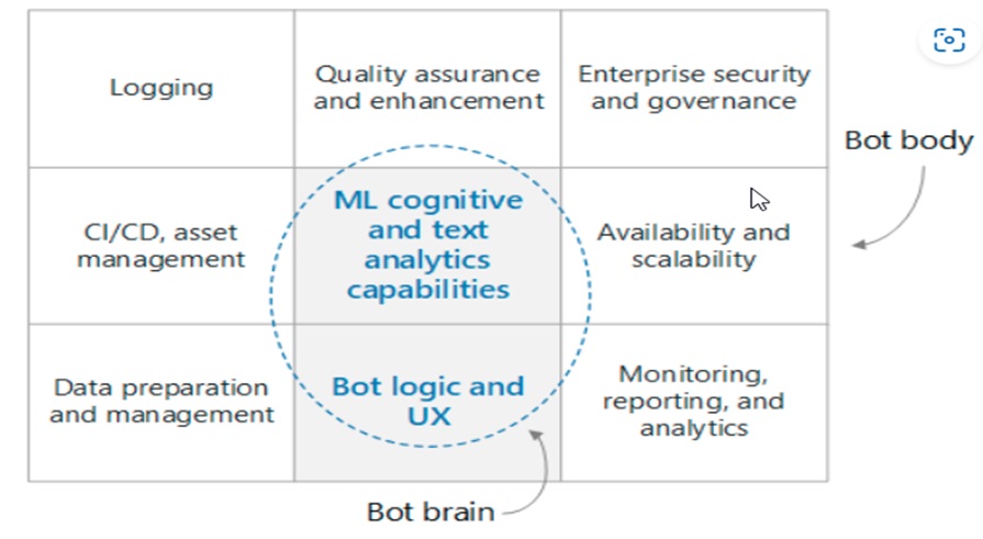 At a high level, a conversational bot can be divided into the bot functionality (the “brain”) and a set of surrounding requirements (the “body”). The brain includes the domain-aware components, including the bot logic and ML capabilities. Other components are domain agnostic and address non-functional requirements such as CI/CD, quality assurance, and security.