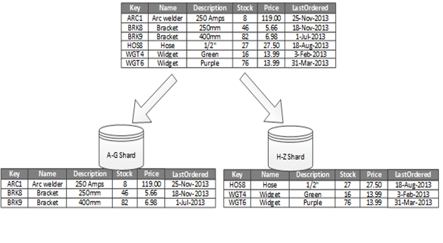 Figure 1 shows horizontal partitioning or sharding. In this example, product inventory data is divided into shards based on the product key. Each shard holds the data for a contiguous range of shard keys (A-G and H-Z), organized alphabetically. Sharding spreads the load over more computers, which reduces contention and improves performance.