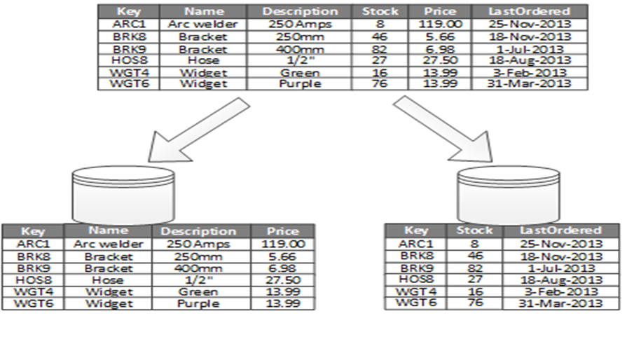 The most common use for vertical partitioning is to reduce the I/O and performance costs associated with fetching items that are frequently accessed. Figure 2 shows an example of vertical partitioning. In this example, different properties of an item are stored in different partitions. One partition holds data that is accessed more frequently, including product name, description, and price. Another partition holds inventory data: the stock count and last-ordered date.